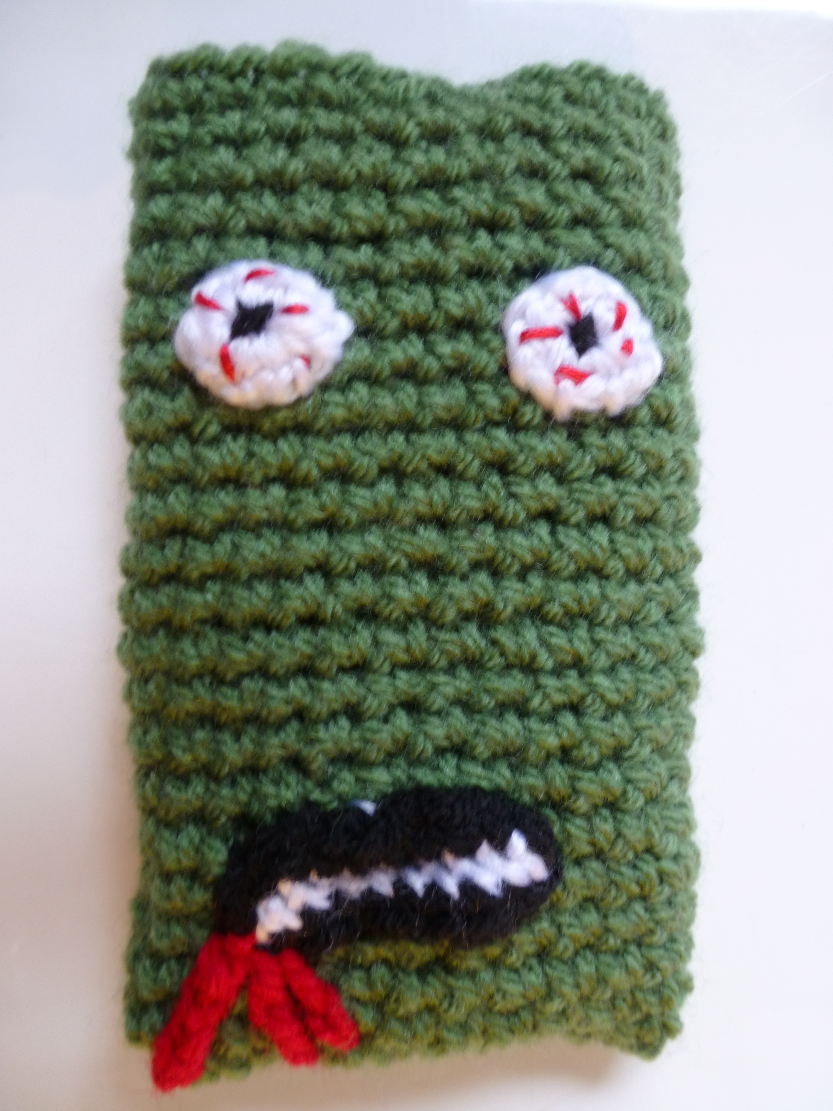Zombie hot mobile phone cover. This is a smaller zombie that the others and fits most mobile phones, including iPhones. It’s got the usual bloodshot eyes and mouth that’s dripping crocheted blood. |